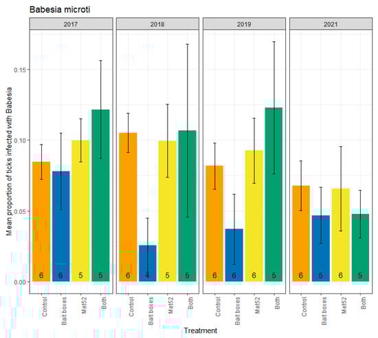 Mean proportion of blacklegged ticks, Ixodes scaplaris, that were infected with Babesia microti, as a function of the acaricidal treatment imposed on residential neighborhoods, over the four years ticks were sampled. Sampling did not occur in 2020 due to COVID-19 restrictions. On the x-axis, Control indicates neighborhoods that had placebo controls for both TCS bait boxes and Met52, Bait boxes indicates neighborhoods that had active bait boxes but placebo Met52, Met52 indicates neighborhoods that had active Met52 but placebo bait boxes, and Both indicates neighborhoods that had active TCS bait boxes and active Met52. Error bars are standard errors. Numbers on bars are the number of neighborhoods (out of 6) for which we were able to assess infection prevalence for at least 10 ticks.