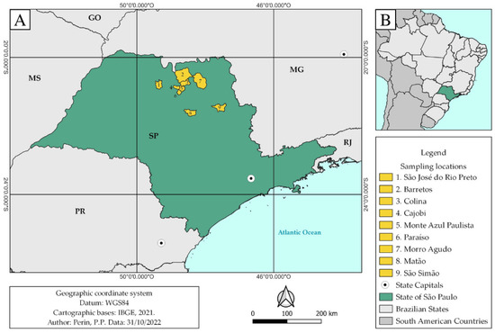 The study was conducted in nine cities within São Paulo State’s northeastern region (Figure 4) and covered an area of approximately 43,000 km2. The sum of the study area’s estimated population is 327,000 people [45]. The vegetation cover is a transition between the Cerrado and Atlantic Forest Biomes. The predominant climate is humid subtropical (Köppen’s modified climate classification), with average monthly temperatures of 18 °C and average annual rainfall between 1200 and 1500 mm. The region has four to five months of drought in winter, between May and September, and is at an average altitude of 600 m above sea level [46,47,48]. The regional economy is strongly dependent on agricultural activities such as sugarcane, orange, rubber, soybean, corn, peanut, and tomato cultivation, as well as beef cattle and poultry farming [49,50,51].