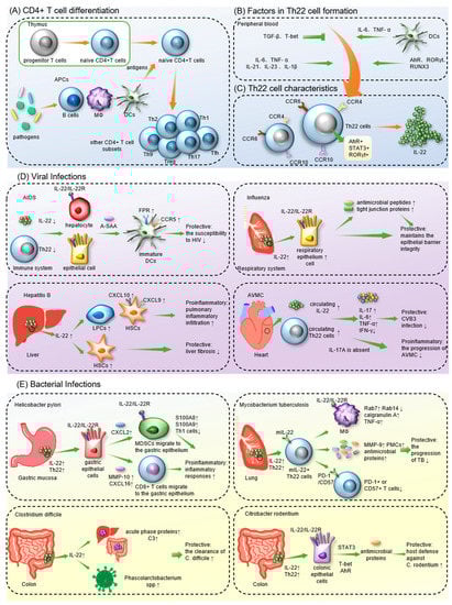 Formation of Th22 cells and IL-22 and the role of Th22/IL-22 in infectious diseases. (A). Naïve CD4+ T cell differentiation. In peripheral blood, different cytokines can stimulate mature naïve CD4+ T cells to differentiate into various lineages. (B) Factors involved in Th22 cell formation. TNF-α, IL-6 (exogenous or released by DCs) and IL-21; and the transcription factors AhR and RORγt, promote Th22 cell differentiation, whereas TGF-β and T-bet suppress it. (C). Characteristics of Th22 cells. Th22 cells are CCR4+CCR6+CCR10+ T cells that express STAT3, AhR and RORγt. IL-22 is the main effector molecule of Th22 cells. (D). The roles of Th22/IL-22 in viral infections. (E). The effects of Th22/IL-22 on bacterial infections. Th22/IL-22 regulates immune responses during infectious diseases by modulating downstream signaling pathways. APCs, antigen-presenting cells; AhR, aryl hydrocarbon receptor; AVMC, acute viral myocarditis; A-SAA, acute-phase serum amyloid A; AIDS, acquired immunodeficiency syndrome; CCR4, C-C motif chemokine receptor 4; CVB3, coxsackievirus B3; DCs, dendritic cells; FPR, formyl peptide receptor; HSCs, hepatic stellate cells; IFN-γ, interferon-γ; LPCs, liver stem/progenitor cells; MΦ, macrophage; MDSCs, myeloid-derived suppressor cells; PMCs, pleural mesothelial cells; RORγt, retinoid-related orphan receptor-γt; STAT3, signal transducer and activator of transcription3; TNF-α, tumor necrosis factor-α; TGF-β, transforming growth factor-β.