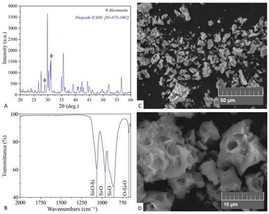 Figure 1 depicts the characterization of synthesized bioceramic material. The data provided by XRD and FT-IR analysis demonstrated the formation of the diopside phase. The XRD pattern (Figure 1A) confirmed diopside formation as a primary phase. The observed phase matched the ICDD card № 01-075-1092. The FT-IR spectrum (Figure 1B) was found to be in good agreement with recently published diopside characterization results, demonstrating the presence of four functional groups’ peaks in the 650–4000 cm−1 range [34]. According to SEM micrographs (Figure 1C,D) the formed product is composed of aggregated porous microparticles.