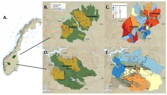 Data about sheep production in Norway was retrieved from Statistics Norway [5] and a database on subsidies driven by the Norwegian Agricultural Directorate (www.data.norge.no, accessed on 18 March 2020). Data on the use of the grazing districts in Nordfjella, Knutshø, and Forollhogna were retrieved from the database “Organisert beitebruk” with the help of Michael Angeloff at the Norwegian Institute for Bioeconomics (NIBIO) on the 18 March 2020, while shapefiles of grazing district borders and other geographical information were collected from https://kilden.nibio.no (accessed on 29 September 2022). Supplemental data on numbers of sheep in Folldal, Rennebu, and Oppdal municipalities were retrieved from public reports on municipal web pages [9,10,11]. Linear regression models were used to analyse the development in total sheep numbers (ewes and lambs) within individual grazing districts during 1992–2018. All statistical analyses were performed in Program R and RStudio (R Core Team 2022, RStudio Team 2022). Only districts with a time series spanning > 15 years were included in these analyses. Spatial variation in sheep number development was plotted using QGIS v. 3.16.4 (Figure 1C,E). To analyse major patterns of within-area trends in sheep numbers, each study area was divided in two subareas, identifying the parts of the area that constituted the bulk of increasing herd sizes. Thus, Nordfjella was split into a western (Lærdal, Austfjelli, Vestfjelli, and Stemmerdalen) and an eastern part (Iungsdalen, Fødalsdrifta, Hemsedal, Ål, and Hol). Knutshø was divided by grazing districts within Oppdal municipality vs. all the remaining areas. Forollhogna was divided by grazing districts within Tynset and Tolga municipalities vs. all the remaining areas. Differential trends in sheep numbers among these subareas during 1992–2018 was analysed using linear regression models (Figure 2).