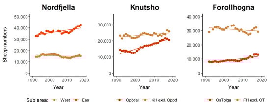 Total sheep numbers (ewes and lambs) of organized grazing units in Nordfjella, Knutshø, and Forollhogna during 1992–2018, each divided into two subareas. Trend lines are predictions from linear regression models.