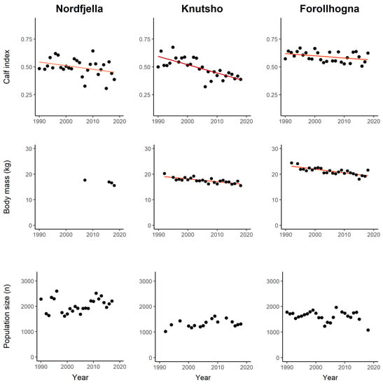In Knutshø, the number of observed calves and adult female/subadults was 139–475 (mean = 351) and 419–1124 (mean = 742), respectively. The calf recruitment index (calf per adult female/subadult) had a highly negative trend (t = −5.69, p < 0.001), representing 35.1% reduction in calf recruitment during 1990–2018 based on model predictions. The annual number of the reported calf body mass was 22–77 (mean = 49). In a linear model with “Sex”, “Julian date”, and “Year” (continuous variable), the year parameter estimate was highly significant (t = −7.6, p < 0.001), representing 13.8% reduction of the calf body mass during 1992–2018. The Knutshø population size ranged between ca 1.000 and 1.600 individuals (mean ca. 1300). Despite some fluctuations in population size, there was no linear trend over the time period (t = 1.56, p = 0.13).