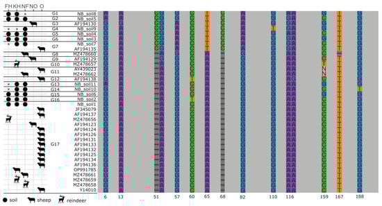 Diagrammatic representation of aligned Nematodirus battus ITS2 sequences derived from Sanger sequencing of adult worms and metabarcoding of soil samples. Conserved regions are shown as grey blocks, while variable positions are highlighted in colour with the alignment position indicated below the column. The complete alignment can be found in Appendix A. Horizontal lines between sequence names denote genotype boundaries and the type of sequence (soil, sheep, or reindeer) and geographic provenance are indicated in the table to the left of the diagram. KN: Knutshø; FH: Forollhogna; NF: Nordfjella; NO: Norway; O: other.
