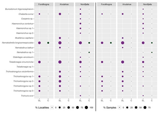 Parasitic nematode DNA detected in active salt lick soil (SL) and controls (C) at different localities in the Forollhogna, Nordfjella, and Knutshø wild reindeer areas. On the left side of the figure, the proportion of positive localities are reported to the left of the centre line, whilst on the right of the figure, the proportion of positive soil samples is reported. Points are sized relative to the percentage of positive localities or samples at which each species was detected. Blanks indicate that a species was absent in the area, while an x indicates the absence of a species in a particular type of location, but a documented presence in the area.