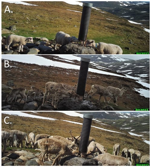 Sample of camera trap data from a single salt lick location in Knutshø during 6–18 June 2020. (A). Sheep at a salt lick stone, (B). Reindeer calf eating soil, and (C). Several reindeer with their nose to the ground “grazing” from the salt lick.