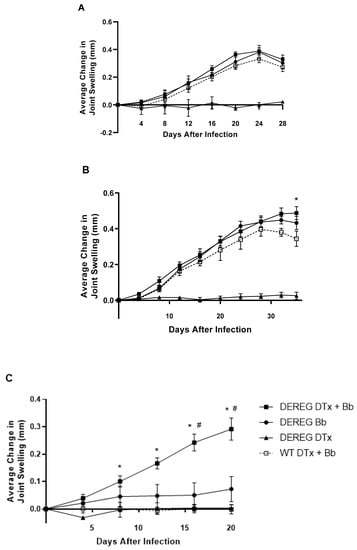 Lyophilized diphtheria toxin (DTx) from Corynebacterium diphtheriae (1 mg; EMD Millipore) was resuspended in filter-sterilized PBS and stored at −80 °C. Mice were injected intraperitoneally with 1 µg of DTx in 50 µL PBS, or with PBS alone, for two consecutive days prior to infection with B. burgdorferi. Groups consisted of BALB/c DEREG mice administered DTx in PBS with or without subsequent infection, BALB/c DEREG mice administered PBS prior to infection, and wild-type BALB/c mice administered DTx in PBS prior to infection. Mice were weighed immediately before administration of DTx and then regularly thereafter for the duration of the studies. Mice were anesthetized with isoflurane prior to all injections.