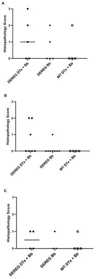 Histopathological scores of the tibiotarsal joints. BALB/c DEREG and wild-type mice were administered DTx in PBS or PBS alone prior to infection with 5 × 103 (A), 1 × 103 (B), or 1 × 102 (C) B. burgdorferi organisms. Histological changes were scored on a 0–3 scale based on the range of observed findings from this study: 0, absence of pathology; 1, a single small focus of inflammation; 2, two or three small foci of inflammation; 3, several larger areas of inflammation. “DEREG DTx + Bb”, DEREG BALB/c mice depleted of Treg cells prior to infection; “DEREG Bb”, DEREG BALB/c mice administered PBS prior to infection; “WT DTx + Bb”, wild-type BALB/c mice treated with DTx prior to infection. Bars indicate the median score. In B, the results are the combined data of two independent experiments. The medians of some groups are 0; as a result, these bars overlap with the x-axis.
