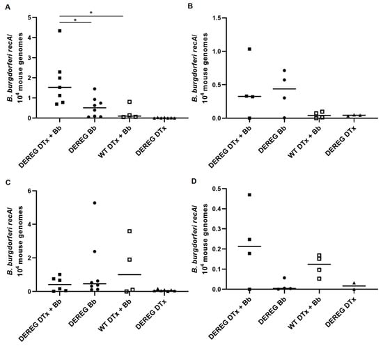 Quantification of borrelial load in tissues of mice depleted of T cells prior to infection with B. burgdorferi. Levels of the B. burgdorferi gene recA in the hearts and tibiotarsal joints of mice were normalized to Mus musculus β-actin. Data were acquired from the hearts (A,B) and tibiotarsal joints (C,D) of mice infected with 1 × 103 B. burgdorferi organisms and euthanized 35 days later (A,C) or of mice infected with 1 × 102 B. burgdorferi organisms and euthanized 20 days later (B,D). “DEREG DTx + Bb”, DEREG BALB/c mice depleted of Treg cells prior to infection (A,C, n = 7; B,D, n = 4); “DEREG Bb”, DEREG BALB/c mice administered PBS prior to infection (A,C, n = 8; B,D, n = 4); “WT DTx + Bb”, wild-type BALB/c mice treated with DTx prior to infection (n = 4); “DEREG DTx”, DEREG BALB/c mice depleted of Treg cells without subsequent infection (A,C, n = 7; B,D, n = 3). *, p ≤ 0.05. Bars represent the median of each group. In A,C, the results are the combined data of two independent experiments. Not shown in C is one mouse in the “DEREG DTx + Bb” group in which exceptionally high levels of recA (406/104 mouse genomes) were detected. In D, one joint from the “DEREG DTx” group was unable to be located among our samples and, as a result, was not measured. The heart tissue from this mouse is shown in B. Our analysis did not indicate significant differences between comparison groups in D.