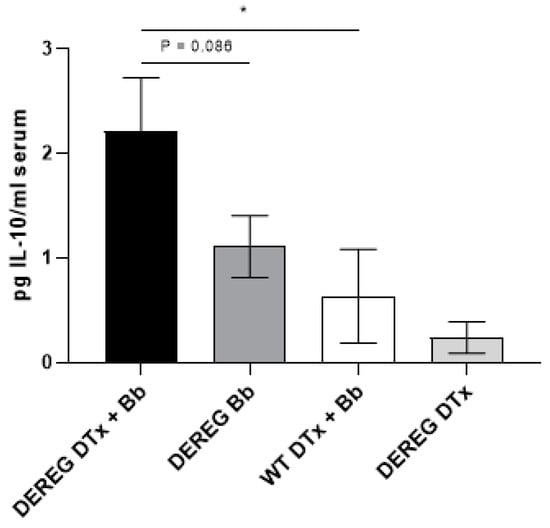We used a multiplex assay to determine the concentrations of several cytokines in the serum of Treg cell-depleted and Treg cell-sufficient mice that were infected with 1 × 103 B. burgdorferi organisms and euthanized 35 days later. The majority of the cytokines we analyzed were not detected in the serum; however, IL-10 was present in low amounts. A significantly (p ≤ 0.05) higher concentration of IL-10 was observed in Treg cell-depleted, B. burgdorferi-infected BALB/c DEREG mice than in wild-type mice treated with DTx prior to infection (Figure 6). In addition, a greater concentration of IL-10 was detected in Treg cell-depleted, infected DEREG mice than in their T cell-sufficient counterparts; however, this difference was not statistically significant (p = 0.086).