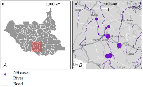 Study site general location (A) and distribution of NS cases in the study area (B). Figure adopted from Abd-Elfarag GOE et al. PLoS Negl Trop Dis 16(7): e0010630. https://doi.org/10.1371/journal.pntd.0010630 (accessed on 24 August 2022).
