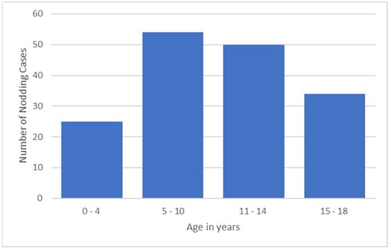 Overall, 22,411 persons were surveyed, of whom 607 (2.7%) were probable NS cases. Fifty (22.3%) presented with head nodding only and 174 (77.68%) with head nodding plus other types of seizures. The median age of onset of the nodding seizures was 10 years; 177 (94%) developed their first seizure between the ages of 3 and 18 years, and 10 (6%) between the ages of 1 and 2 years. In the majority (104/63.8%) of the NS cases, the onset of the seizures was in the 5–14-year-old age group (Figure 2).