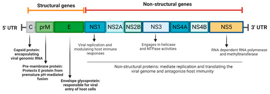 Schematic representation of Zika virus genome (created with BioRender.com on 22 January 2023).