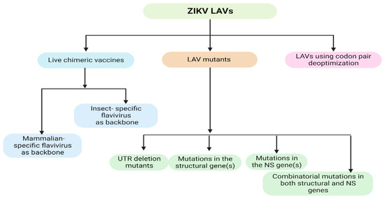 Schematic representation of current attenuation approaches to generate LAV ZIKV vaccines (created with BioRender.com on 22 January 2023).