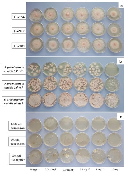 Different concentrations of fluxapyroxad added to Czapek Dox propiconazole dichloran agar (CZPD). (a) Growth of Fusarium graminearum culture from mycelial plug, (b) growth of F. graminearum from conidial suspension and (c) growth from soil suspension on (from left) CZPD-unamended, fungicide a.i at 0.001, 0.01, 0.1, 1, 10 mg·L−1 CZPD after 5 days of incubation at room temperature (ca. 18 °C).