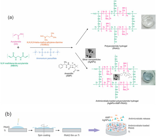 Schematic representation of (a) PAAG and antimicrobial-loaded PAAG preparation; (b) Ti coating and antimicrobials released from the AgNPs+AMP–PAAG–Ti.