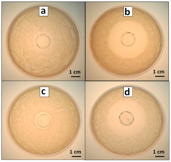 Inhibition halo in S. aureus culture on gelled media. (a) PAAG, (b) AMP–PAAG, (c) AgNPs–PAAG, (d) AgNPs+AMP–PAAG.