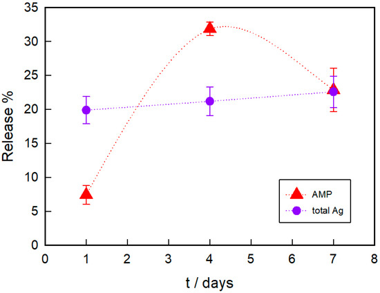 Figure 4 shows the released percentage of both AgNPs and AMP from the hydrogel. As it can be seen, the total Ag amount is held at about 20% as time increases, indicating that after 24 h no further release is produced. However, the amount of AMP rises from 7.4% to 31.8% as time goes from 1 to 4 days. After a week, only 22.9% AMP is found in the aqueous media, a value lower than that measured on the fourth day. Regarding this, the AMP stability in aqueous solution should be taken into account. Kang et al. measured the remaining amount of AMP dissolved in sterile water after 7 days at room temperature and found that 20% of the original amount of AMP breaks down [54]. Thus, some released AMP could be degraded after 7 days in the aqueous media. At this point, it is worth mentioning that a lower release of AMP compared with AgNPs leads to a higher antimicrobial activity, which can be interpreted in terms of the different bacterial susceptibility of S. aureus to these agents.