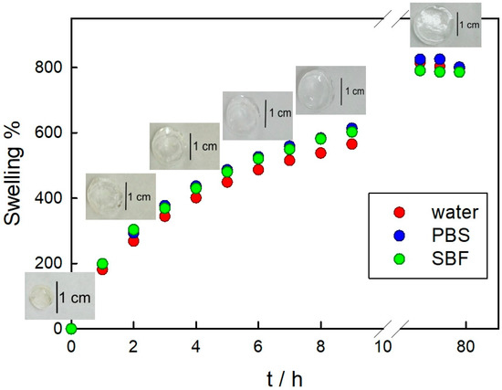 The swelling assays were carried out in three different media: ultrapure water, phosphate-buffered saline solution (PBS), and simulated body fluid (SBF). The SBF solution was prepared according to Kokubo et al. [46]. PAAG samples (1 cm3) were dried until constant mass and accurately weighted. After that, each sample was immersed in each medium. The mass of each sample was verified every 60 min by eliminating the adsorbed liquid with soft tissue paper and weighting. The equilibrium swelling was reached when the mass of the swollen samples did not change after 3 measurements. The swelling was expressed as