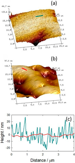 AFM topographic image (15 μm × 15 μm) of (a) Ti surface and (b) PAAG–Ti surface; (c) Cross-sectional analysis of Ti and PAAG–Ti surfaces along the cyan line in (a) and along the red line in (b), respectively.
