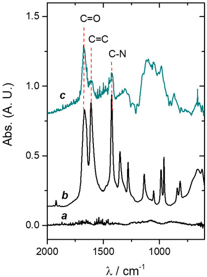 The evaluation of the chemical composition of the surface evidences the presence of the surface coating. Thus, FTIR–ATR measurements were carried out. Figure 7 shows the spectra corresponding to Ti, AA on Ti (drop casting), and PAAG–Ti. It can be observed that the characteristic bands due to PAAG appear in the 1400 and 1600 cm−1 region (Figure 7, line c) [63,64]. The typical bands at 1660 cm−1 correspond to the C=O stretching vibrations [65] and 1426 cm−1 is assigned to C-N stretching vibrations [65]. In the spectrum of AA deposited on Ti by drop casting (Figure 7, line b), the band at 1648 cm−1 corresponding to the C=C stretching vibrations is observed [64]. In the PAAG spectrum, this band diminished significantly, which would indicate the successful polymerization and the effective washing process to remove AA residues.