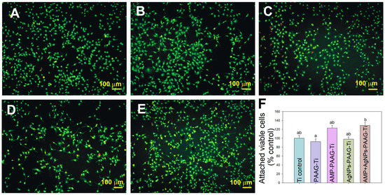 Epifluorescence images of pre-osteoblast cells (MC3T3-E1) cultured on the modified Ti surfaces: (A) Ti control (bare Ti); (B) PAAG–Ti; (C) AMP–PAAG–Ti; (D) AgNPs–PAAG–Ti; (E) AgNPs+AMP–PAAG–Ti. (F) Quantification of viable attached pre-osteoblast cells (MC3T3E-1) growing on modified Ti surfaces expressed as a percentage of Ti control. Data are expressed as mean ± standard error of the mean (SEM). Statistical differences were analyzed using multiple comparisons of Bonferroni with 99.9% of confidence. There are no statistically significant differences between data sharing identical letters in the graph.