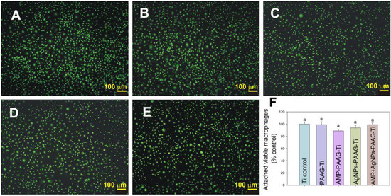 Epifluorescence images of RAW 264.7 macrophages cultured on the modified Ti surfaces: (A) Ti control; (B) PAAG–Ti; (C) AMP–PAAG–Ti; (D) AgNPs–PAAG–Ti; (E) AgNPs+AMP–PAAG–Ti. (F) Quantification of viable attached RAW 264.7 macrophage cells growing on modified Ti surfaces expressed as percentage of Ti control. Data are expressed as mean ± SEM. Statistical differences were analyzed using multiple comparisons of Bonferroni with 99.9% of confidence. There are not statistically significant differences between data sharing identical letters in the graph.