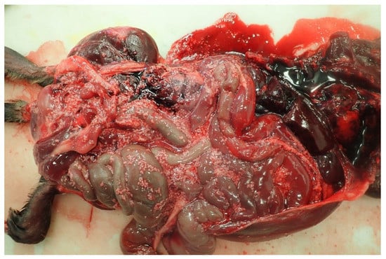Necropsy examination of the peritoneal cavity of muskrat: Round to slightly square, white, soft structures (2–6 mm in diameter) are evident on the serosal surface of the abdominal organs and freely within the abdominal cavity.