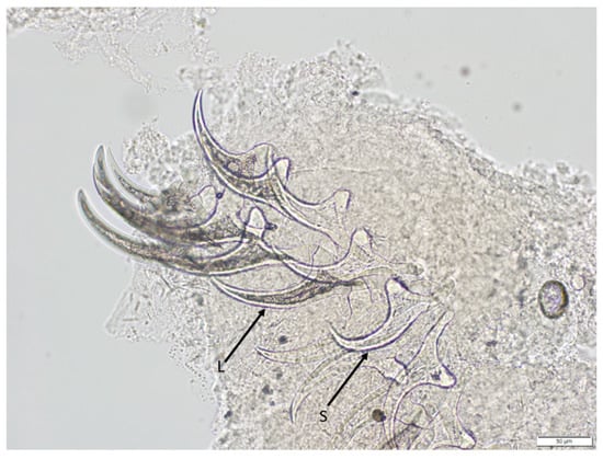 High-magnification photomicrography of T. crassiceps hooks retrieved from a cysticercus collected from the muskrat. Both large hooks (L) and small hooks (S) are evident. Note the characteristic long blade and relatively short handle typical for T. crassiceps hooks. Scale bar = 50 μm.