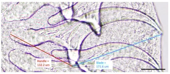 High-magnification photomicrography of T. crassiceps hooks retrieved from a cysticercus collected from the dog. Guard to blade length (blue line, 171.6 μm) of a representative large hook is longer than the handle to guard length (red line, 132.2 μm), typical for T. crassiceps. Scale bar = 50 μm.