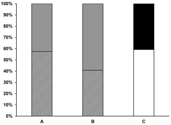 Post-sand fly exposure feeding score and infection status of Phlebotomus duboscqi. (A) Post-exposure feeding score of 10 non-infected sand flies. (B) Post-transmission feeding score of 10 infected sand flies. (C) Post-transmission L. major infection status in 10 infected sand flies. Striped bars, fully fed; Grey bars, partially fed; White bars, the number of sand flies showing excellent transmissible infections; Black bars, number of sand flies showing moderate transmissible infections. Data are representative of two independent experiments; n = 6 ears per group.