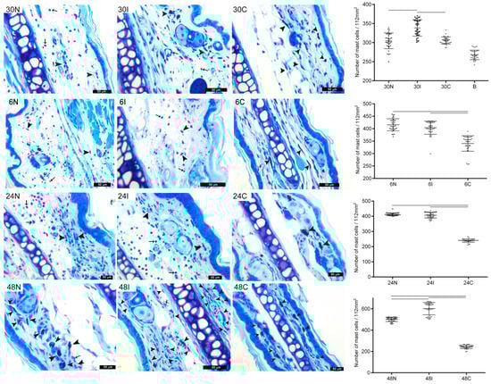 MC degranulation after Ph. duboscqi bites. Mast cell degranulation after non-infected sand fly bites at 30 min, 6 h, and 48 h (30N, 6N, and 48N), Leishmania major-infected sand fly bites (30I, 6I, 48I) or in controls exposed to an empty vial (30C, 6C, and 48C). MC (black arrowheads) are defined by numerous cytoplasmic deep violet metachromatic granules of various sizes. Bar = 50 μm in 30N, 30I, 30C, 6C, and 48C. Bar = 25 μm in 6N, 6I, 48N, and 48I. Representative images of each experimental condition from two independent experiments are shown; n = 4.