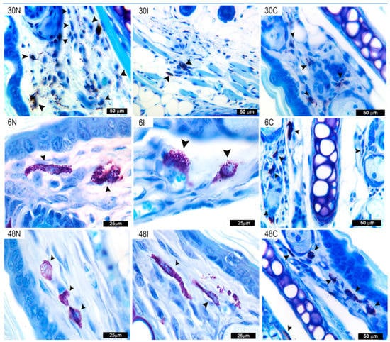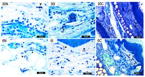 Mast cell degranulation with neutrophil infiltration. Neutrophil infiltration at sites of mast cell degranulation at 30 min (30N and 30I) and 6 h (6N and 6I) after non-infected and infected sand fly bites or in controls not exposed to sand fly bites or parasites at 30 min and 6 h (30C and 6C). Black arrowheads: MC identified by toluidine blue staining as large cells containing numerous deep violet metachromatic granules of various sizes. Black arrows: neutrophils identified by their tri-lobular nuclei. Bars = 25 μm in 30N, 30I, 6N, and 6I; Bars = 50 μm in 30C and 6C. Representative images of each experimental condition from two independent experiments are shown; n = 4.