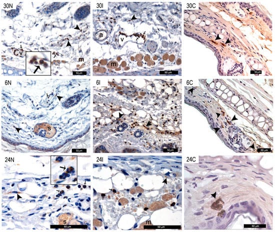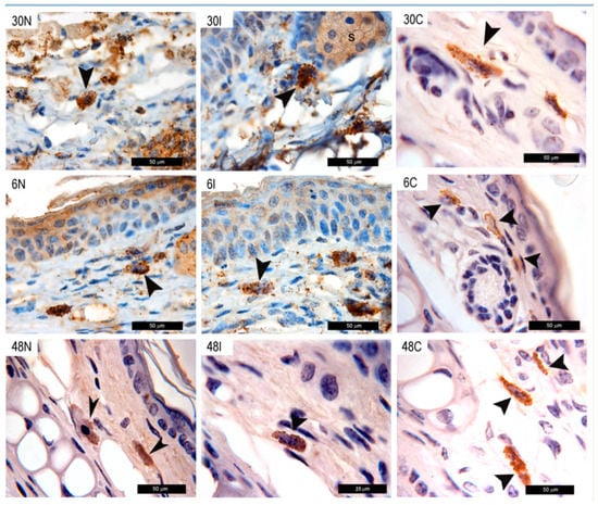 Histamine staining following Ph. duboscqi bites. Histamine staining after non-infected bites at 30 min, 6 h, and 48 h (30N, 6N, and 48N); Leishmania-infected sand fly bites (30I, 6I, and 48I); or in controls not exposed to sand fly bites or parasites (30C, 6C, and 48C). Histamine is evidenced by brown staining (peroxidase) in MC (black arrowheads). Bars = 50 μm in 30N, 30I, 30C, 6N, 6I, 6C, 48N, and 48C. Bars = 25 μm in 48I. Representative images of each experimental condition from two independent experiments are shown; n = 4.