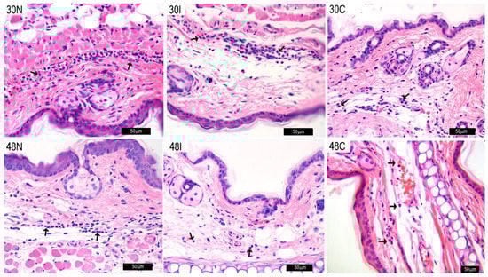 Neutrophil infiltration in earlobes following Ph. duboscqi bites. Vascular congestion, vasodilatation and diapedesis of neutrophils into tissues at 30 min after non-infected (30N), infected sand fly bites (30I), and in controls (30C). Neutrophil diapedesis and tissue localization in non-infected (48N), infected (48I) sand fly bites, and in controls (48C) at 48 h. Neutrophils can be identified by their tri-lobular nuclei. Black arrows: neutrophils. Bars = 50 μm. Representative images of each experimental condition from two independent experiments are shown; n = 4.