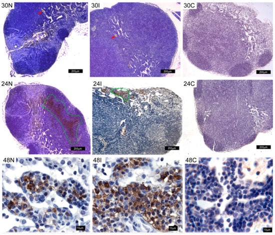 TNF-α staining in mandibular lymph nodes after Ph. duboscqi bites. TNF-α staining in mandibular lymph nodes after non-infected at 30 min, 24 h, and 48 h (30N, 24N, and 48N); Leishmania-infected sand fly bites (30I, 24I, and 48I); or in controls not exposed to sand fly bites (30C, 24C, and 48C). Red arrows indicate blood vessels of the medullary cords. Green outline shows TNF-α stain diffusely spread in the paracortical area of the lymph node. Brown staining (peroxidase) shows TNF-α concentrated within mononuclear cells (possibly lymphoid cells) of medullary cords, as well as diffusely spread within the lymphoid tissue. Bars = 10 μm in 48N, 48I, and 48C. Bars = 200 μm in 30N, 30I, 30C, 24N, 24I, and 24C. Representative images of each experimental condition from two independent experiments are shown; n = 4.