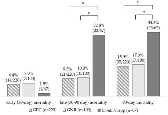 Mortality of patients with persistent bacteremia due to gram-positive cocci, gram-negative rods, and Candida species. GPC, gram-positive cocci; GNRs, gram-negative rods. * p < 0.050.