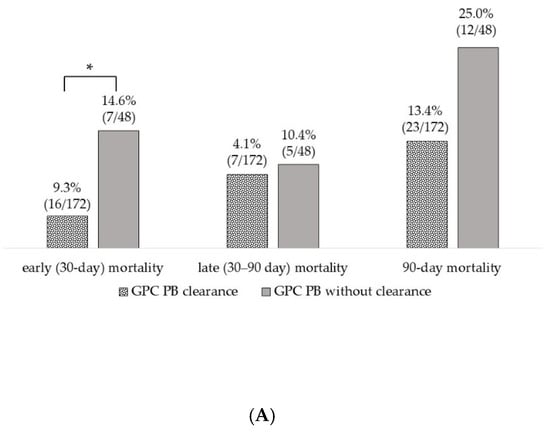Differences in mortality between patients with and without clearance of persistent bacteremia. (A) persistent bacteremia (PB) due to gram-positive cocci; (B) PB due to gram-negative rods; (C) PB due to Candida spp. GPC, gram-positive cocci; GNR, gram-negative rods; PB, persistent bacteremia. * p < 0.050, ** p < 0.010.