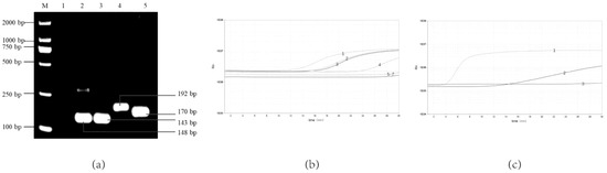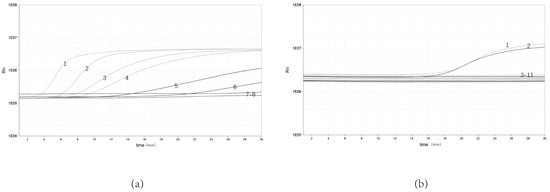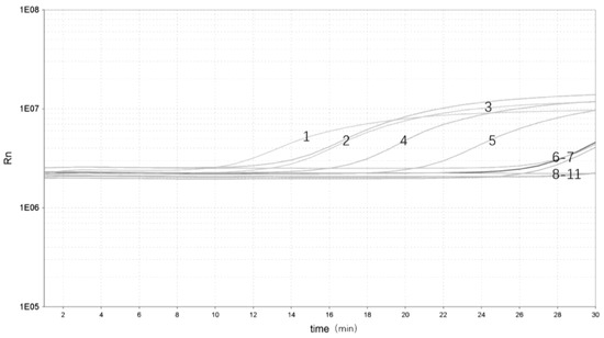 To determine the sensitivity of the real-time RPA assay, bacterial genomic DNA from 10 to10−5 ng/μL were selected for the test. The results showed that the real-time RPA could be detected at a minimum concentration of 10−4 ng/μL. The real-time RPA assay could be detected in as little as 3 min (Figure 2a).