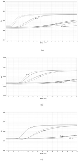 Repeatability of the real-time RPA assay. (a–c) Repeatability of the real-time RPA assay with different groups: 1–3, 100 ng/μL; 4–6, 10−2 ng/μL; 7–9, 10−5 ng/μL; 10–12, NTC.