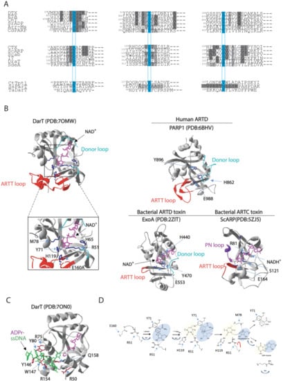 ADP-ribosylation catalysed by DarT specifically targets the thymidine bases present in conserved ssDNA sequence NNTNTCN in T. aquaticus and TTTT/A in M. tuberculosis, respectively, thereby showing no activity on dsDNA and RNA or protein targets. Substrate specificity toward a thymidine base also takes place for DarT toxin homologues, as highlighted in enteropathogenic E. coli DarT, which shows a preference for TCT/TTT sequences by modifying the third thymidine base of these motifs [40]. From a structural point of view, DarT can be considered a divergent ART enzyme given that it lacks the canonical catalytic triad residues found in ARTD and ARTC bacterial endotoxins (Figure 2A). Compared to bacterial ARTDs and ARTCs, DarT is very variable in terms of primary structure and motifs in comparison with bacterial ARTDs and ARTCs (Figure 2A). Nevertheless, the overall ART fold is maintained, as revealed by 3D resolution structural insights into Thermus sp. 2.9 DarT [78]. In fact, DarT is a PARP-like enzyme [78], as also predicted by phylogenetically analyses, as it is closer to human ARTDs than bacterial ART counterparts (Figure 2B).