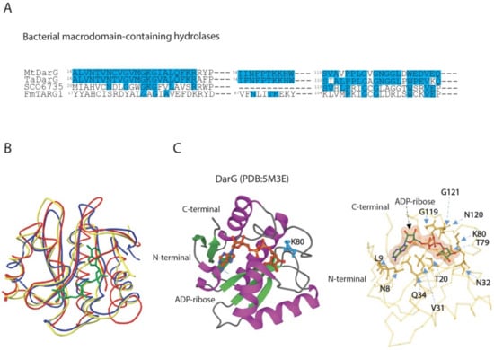 The macrodomain-containing hydrolase DarG from T. aquaticus reverts DNA-ADP-ribosylation adduct on the thymidine base as observed in overexpressing E. coli cells with the consequent rescue of cell growth [38]. DarG antitoxins, which were characterised in T. aquaticus and M. tuberculosis, show a 56.4% sequence identity and a low sequence similarity to other bacterial macrodomain-containing hydrolases (Figure 3A).
