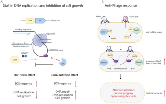 The DarT/DarG TA system modulates the anti-phage response through the ADP-ribosylation of viral DNA and the consequent induction of the abortive infection mechanism [146] (Figure 4B). As already mentioned above, abortive infection is a well-conserved mechanism within bacterial immunity, and is widespread in Gram-positive and Gram-negative bacteria, where cell death takes place prior to the maturation of the phage progeny, thus preventing the spread of phages to neighbouring cells and protecting the bacterial population.