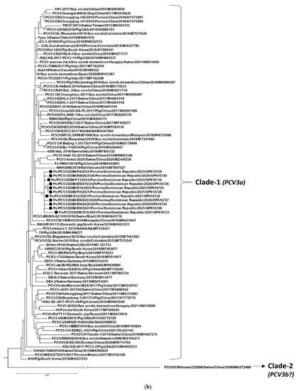 Phylogenetic analyses of the nucleotide sequences of open reading frame 2 (a) and complete genomes (b) of Porcine circovirus 3 (PCV3) strains from the Dominican Republic with those of other PCV3 strains representing different countries. The strain name/year/host species/country/year/GenBank accession number are shown for all PCV3 strains. Black circles indicate the PCV3 strains detected from the Dominican Republic. The classification scheme by Franzo et al. [18] does not formally recognize PCV3 strains within Clade-2 as a genotype. Although Clade-2 consisted of two PCV3 sequences, GenBank accession number MG372490 was removed at the submitter’s request (https://www.ncbi.nlm.nih.gov/nuccore/MG372490, accessed on 18 October 2022), and could not be included in the present analysis. In figure (a,b), porcine circovirus 2 strain 22625-33-PCV2/Swine/USA/2012/JX535296 was used as the outgroup sequence (not shown here due to space constraints). Bootstrap values <65% are not shown. Scale bar, 0.02 substitutions per nucleotide.
