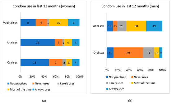 Condom use over the previous 12 months for different sexual practices (vaginal sex (receptive), oral sex (active), and anal sex (receptive)) in (a) women (n = 31 participants) and (b) men (n = 169 participants).