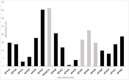 The HPV typing method included HR-HPV types 16, 18, 31, 33, 45, 52, 58, 59, 35, 68, 39, and 66 and LR-HPV types 6/11, 42, 43, and 44. HPV genotypes were identified in 112 (96.6%) of the 116 positive samples. The remaining four HPV positives (3.4%) had non-identifiable genotypes (not included in the 18 genotype primers used). In general, the most frequent genotypes detected were LR-HPV 6/11 (36.3%) and HR-HPV33 (35.3%). HR-HPV 16, 18, 45, 51, and 66 were found at frequencies of 14.7, 13.7, 17.6, 13.7, and 18.6%, respectively. LR-HPV 43, 24, and 44 were also found (in 22.5, 16.7, 14.7% of the sample, respectively) (Figure 3).