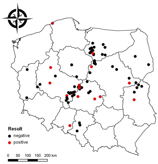 Riemerella anatipestifer (RA), previously known as Pasteurella anatipestifer or Moraxella anatipestifer, is a Gram-negative, rod-shaped bacterium of the Flavobacteriaceae family and Riemerella genus [1]. Riemerella anatipestifer affects ducklings, goslings, turkeys, other domestic fowl species and also wild birds. The infection can be transmitted horizontally through the respiratory tract and skin wounds [2], but the vertical transmission of RA is also possible [3,4]. However, the exact mechanism of RA transmission among different bird species is still unknown. Cooper [5] speculated that mosquitoes might be vectors for RA transmission in field outbreaks, but this aspect needs to be confirmed in further studies. Infection with RA can cause acute or chronic disease in birds that manifests with respiratory signs, lameness and central nervous system symptoms. Young birds are most susceptible to acute illness with high mortality and morbidity, but RA can also occur in adult birds, causing only subclinical or asymptomatic disease [6]. The disease can be triggered by deterioration in the welfare of the birds, a common cause of which is their transportation, or a sudden change in environmental conditions [7]. Riemerellosis causes substantial economic losses in those countries where ducks are one of the most important branches of animal farming, such as China and countries in Southeast Asia. In Europe, Poland is the third largest producer—after Hungary and France—of duck and goose meat [8,9]. According to Statistics Poland data, the population of ducks in Poland in 2021 was more than 5.2 million, and that of geese more than 892,000 [10]. It is worth noting that the national poultry flock in Poland has been severely reduced in recent years by highly pathogenic avian influenza [11,12]. Economic losses due to RA infections in waterfowl are of significant concern. Its considerable economic impact is caused by increased mortality, reduced growth rates and raised condemnation rates of carcasses at slaughter. Riemerella anatipestifer spreads rapidly to various tissues of infected birds, the rapidity depending on the virulence of the strain. The mortality of ducklings infected with R. anatipestifer before the fifth week of life ranges from 5% to 75%, and morbidity can reach 100% [2]. Older waterfowl usually suffer chronic, non-fatal or subclinical diseases. Hess et al. [4] found that in commercial flocks of geese infected with RA, clinical signs could occur at 8–10 days of age, and mortality ranged from 5% to 20% and morbidity from 20% to 30%. Viral and bacterial infections specific to the bird species can enhance the pathogenesis of RA. Rubbenstroth [13] reported that avian metapneumovirus was associated with RA infection in turkeys. Infections with RA in waterfowl are commonly reported in coinfections with duck hepatitis virus, duck plague virus, circoviruses, or E. coli [14,15,16]. The impact of RA infections in commercial poultry is well documented, and most studies describe clinical cases of RA infection in birds with severe disease symptoms. However, no epidemiological study of RA has yet been conducted in Poland. This study aimed to gain knowledge about the occurrence of RA infection in different types of commercial poultry in Poland, as well as to verify the potential role of wild geese as vectors of this pathogen.