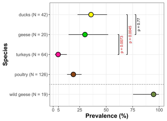 All the locations where samples were taken and the RA-positivity or -negativity of a tested flock are presented in Figure 1. We tested a total of 126 commercial poultry farms, of which 24 were RA positive (19.0%; 95% CI: 13.1–26.8%). The prevalence of RA was similar in duck (35.7%; 95% CI: 22.9–50.8%) and goose flocks (30.0%; 95% CI: 14.5–51.8%) and the lowest RA prevalence was found in turkeys (3.2%; 95% CI: 0.8–10.8%) (Figure 2). Of the 19 wild geese tested, 18 were RA positive (94.7%, 95% CI: 75.4–99.7%) (Figure 2).