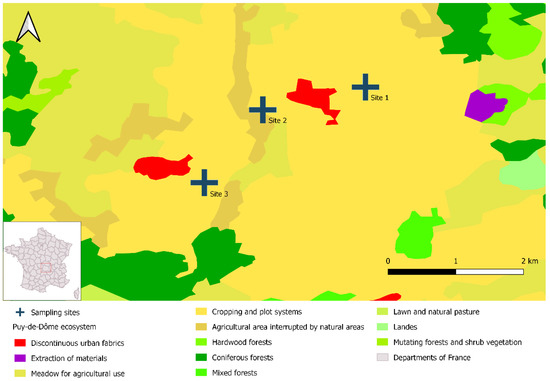 Location of the three study sites in Puy-de-Dôme, France. The map was created with DIVA-GIS (v. 7.5) and data from Corine Land Cover (2018 Edition, mainland France); it was designed with QGIS 3.16.1 Hannover.