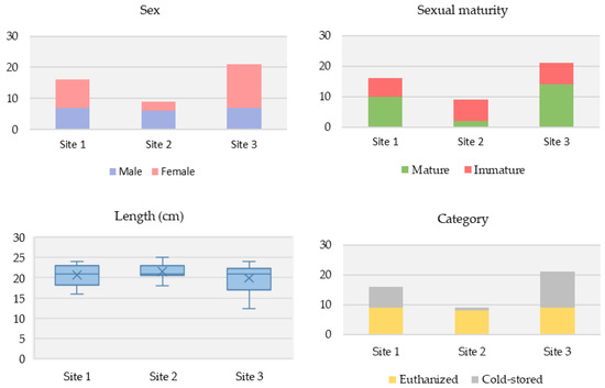 Differences in vole characteristics across the three Puy-de-Dôme study sites. (Top left): Sex. (Top right): Sexual maturity status. (Bottom left): Overall average length. (Bottom right): Sampling category.